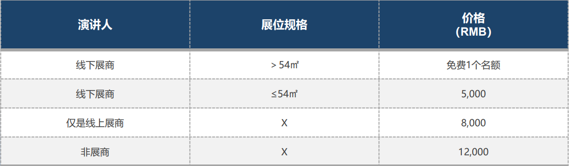 備注:特邀演講人/展商(>54 ㎡)可免費(fèi)在以上話題中選擇或自定議題發(fā)表演講;不符合免費(fèi)邀請條件的個人、單位、展商,請按 5,000-12,000 元/場/30分鐘付費(fèi)。
