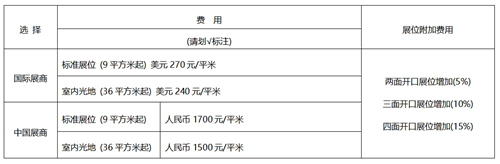 注:1)對于室內光地參展商,展位搭建費用由自己承擔,展館管理方將收取施工管理費。