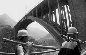 25日,鄭州鐵路局橋隧大修段的職工開始為亞洲第一跨鐵路橋———太原至焦作鐵路焦作丹河鐵路大橋橋體進(jìn)行維護(hù)(如圖)。技術(shù)人員說,該橋建成于1959年,橋高88米,跨度130米,在同類鐵路橋中為亞洲第一,自1984年以來,該橋未進(jìn)行過橋體維護(hù),為此,鄭州鐵路局決定,對(duì)該橋進(jìn)行橋體噴涂防腐、防風(fēng)化涂料。 |