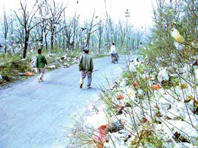 在京郊的一條公路兩邊,各色塑料袋掛滿枝頭。(資料圖片)高 源/攝
