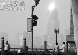 在武昌漢陽門江邊,隔江向佳麗廣場望去,只見其樓頂的玻璃幕墻在太陽光的照射下,形成一個巨大的刺眼光團,猶如天空