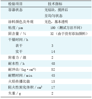試驗中的乳液阻燃涂料是水基涂料的一種,具有以下特點: (1 )以水為溶劑、稀釋劑,不但降低涂料成本,而且無污染,對自然環境沒有危害,符合環保規定; (2 )由于采用了苯乙烯為單體涂膜硬度高、耐水、耐久性好; (3) 涂膜聚合物采用苯丙/蒙脫土納米復合材料不但降低了涂膜的重量和厚度,而且賦予涂膜較好的阻燃性能,見表 1 。