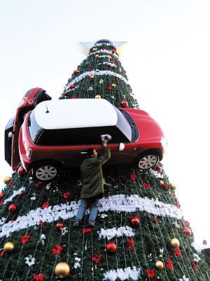 昨天下午,工人體育場門前豎起高達(dá)15米左右的圣誕樹。令人驚嘆的是,圣誕樹上竟然“開”上了三輛紅色MINI Cooper,引得很多人駐足圍觀。據(jù)工作人員介紹,樹上的車是MINI Cooper實車大小的模型,玻璃鋼材質(zhì),德國進(jìn)口,每個重180kg。這棵圣誕樹加上基座高15米,一共用28.6萬枝松枝。