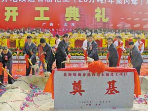 廣西壯族自治區黨委常委、北海市委書記溫卡華宣布項目開工;廣西壯族自治區副主席林念修,北海市市長連友農,中國石化股份公司總裁王天普參加開工典禮并致辭。