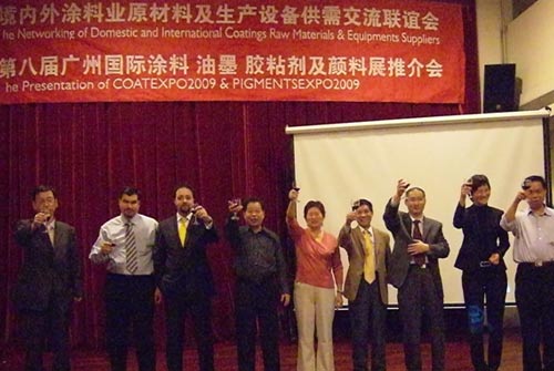 由廣東涂料行業協會、順德涂料商會、智展展覽有限公司會同韓國JHInternational公司、土耳其ArtkimGroup等多家海外合作機構舉辦的境內外涂料業原材料及生產設備供需交流聯誼會及第八屆廣州國際涂料展推介會于2008年11月26日圓滿結束。韓國涂料行業協會、澳大利亞油漆生產者聯合會、澳大利亞駐廣州總領事館、印度小規模油漆協會、日本涂料報知新聞社ThePaint&FinishingNews、國際涂層涂裝工業協會以及150多家的國內外涂料業、原材料及生產設備企業應邀出席了會議。(企業代表:Bauwerk(寶威)礦物涂料公司、IndulorAG、伊立歐化學有限公司Eliokem、希必思色漿CPSColor、空氣化工AirProducts、杜邦鈦白科技DupontTitaniumTechnologies、巴斯夫中國BASFChina、GaematechCo.,Ltd、格雷斯中國W.R.Grace、HankuckLaticesCo.,Ltd.、WooshinPigmentCo.,Ltd、GaematechCo.,Ltd、Young’sCorporation、HankuckLaticesCo.,Ltd、日本四國化研有限公司廣州事務所SikokuKaken(Shanghai)Co.,Ltd.GuangzhouBranch、世界礦產公司、中華制漆(深圳)有限公司、廣東高科力新材料有限公司、蘇天音化工有限公司、珂迪樹脂有限公司等。)