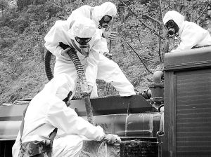 6月22日,成都軍區(qū)某集團(tuán)軍防化團(tuán)又一次在北川縣城進(jìn)行洗消。與以往不同的是,官兵穿著的防護(hù)服由原來(lái)的淺綠色變成了白色。據(jù)該集團(tuán)軍防化團(tuán)團(tuán)長(zhǎng)謝志榮介紹:“除了顏色不同外,新一代防護(hù)服既具有以前防護(hù)服的功能,還具有透濕、抗靜電、抗皮膚刺激、耐洗消、物理機(jī)械性能好等特點(diǎn),可長(zhǎng)時(shí)間穿著和作戰(zhàn)。”