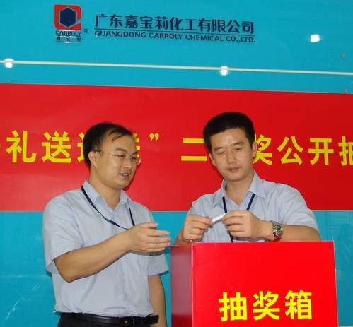 8月5日,在江門市公證處的現場監督和公證下,嘉寶莉漆“慶六一,好禮送!送!送!”連環促銷二重獎抽獎活動在廣東嘉寶莉化工有限公司順利舉行。本次抽獎活動本著公平、公正、公開的原則,共抽出了特等獎3名,一等獎6名,二等獎20名,三等獎150名,四等獎711名,以回饋消費者多年來對嘉寶莉的支持,向社會充分展現了企業良好的誠信品牌形象。