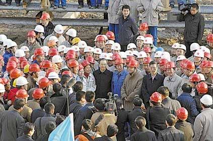 在參建職工隊伍前,溫總理一邊向大家揮手一邊說:“同志們,我來看望大家,大家辛苦了。”在場的干部職工齊聲說:“總理辛苦!”