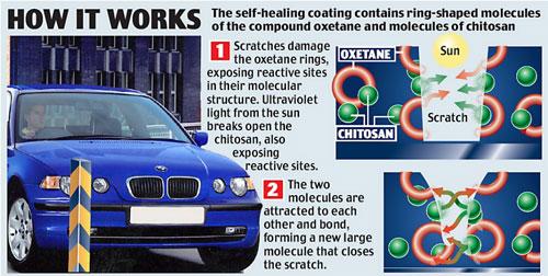 這是一種聚亞胺酯涂層,一種用于塑料、泡沫和膠片的材料,這種材料含殼聚糖,殼聚糖是來自蟹殼、龍蝦殼、蝦殼和叫做氧雜環(huán)丁烷的一種有機(jī)化合物。當(dāng)涂層被劃后,氧雜環(huán)丁烷的環(huán)就會被破壞,化學(xué)反應(yīng)活性部位就會被暴露。紫外線會爆裂殼聚糖分子,另一反應(yīng)活性部位就暴露在外。氧雜環(huán)丁烷和殼聚糖彼此吸引,粘結(jié)和閉合劃痕。這種材料可能被用于制作汽車油漆,或者屏幕、眼鏡或表盤的塑料透明涂層。