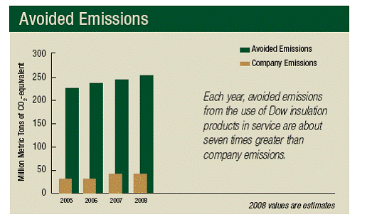 全球領先的化工企業陶氏化學公司日前發表了 2008 年第四季度可持續發展報告。報告中首次公布,經第三方進行的生命周期評估(life cycle assessment, LCA )驗證,在住宅、商業建筑和工業管道上使用陶氏隔熱保溫材料后使溫室氣體排放大幅減少,所減少的排放量達到陶氏公司自身排放總量的七倍。
