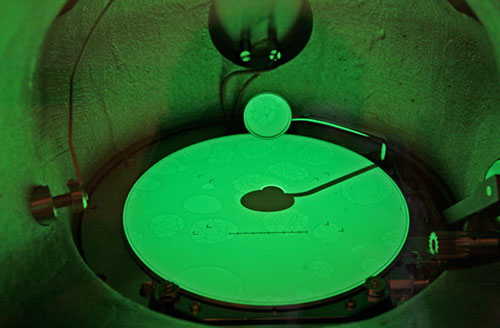 在組織樣本的下面,成像室發出綠光。如果使用更陳舊的顯微鏡,研究人員會在這個部位放一張特制的照相膠片。這種電子探針微量分析儀(JEOL)利用一個電子探測器來幫助完成自動成像操作。