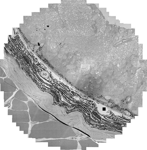 電子顯微鏡快速掃描這個區域后,自動放大到5,500倍來拍攝了上千張的圖片。每張圖片的邊緣因放大散射現象而被扭曲了。也就是說,顯微鏡使每一張圖片出現了變形,因此拼接起來特別棘手。為了解決這個問題,科學計算和成像研究所(SCI)的研究人員開發了一款專用軟件,用來糾正圖片的變形現象,并將這些圖片 完好地拼成一張合成圖。