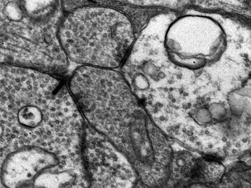 此部分合成圖的中心是一個放大5,500倍的雙極細胞。圖片右側則是一個普遍存在但是很神秘的無長突細胞,它看起來比其他細胞更亮。每個細胞里的暗色環是氣泡囊,里面塞滿了發送信號的化學物質。每個氣泡囊就是一個神經傳遞素的儲存室,直到一個細胞準備把信號傳遞給鄰近的細胞時才會將這些化學物質釋放出來。