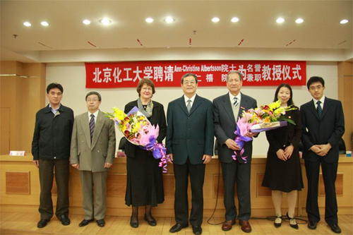 首先由楊萬泰院長介紹了Ann-Christine Albertsson院士和卓仁禧院士的履歷及研究成就,然后王子鎬校長為兩位院士頒發名譽教授及兼職教授聘書,學生代表為兩位院士獻花并佩戴校徽。隨后,王子鎬校長代表學校對Ann-Christine Albertsson院士和卓仁禧院士聘任為學校名譽教授及兼職教授表示熱烈的歡迎,感謝兩位院士關心和支持該校生物材料學科的發展。最后,Ann-Christine Albertsson院士和卓仁禧院士發表了熱情洋溢的講話,他們感謝化工大學給予的殊榮,并表示會為學校生物材料學科的進一步發展做出應有的貢獻。