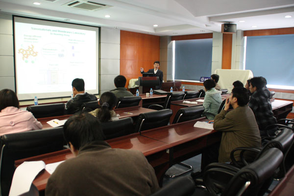 王煥庭教授做了題為“Zeolite Nanocrystals and Zeolite-polymer Nanocomposite Membranes”的學術報告,并與所內科研人員進行了熱烈討論。報告詳細介紹了分子篩納米結構的合成、分子篩與高分子復合膜材料在海水淡化處理、氣體分離(N2/O2)以及質子交換膜燃料電池和直接甲醇燃料電池等領域的研究進展。