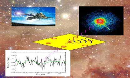 《天文學(xué)與天體物理學(xué)》藝術(shù)家眼中的遙遠(yuǎn)X射線源(右上)被星際塵埃粒子(黃色平面)截獲,其中激發(fā)原子與相鄰原子內(nèi)電子的發(fā)射和吸收得到X射線譜圖正弦行為(左下)。左上角是XMM衛(wèi)星的圖片。