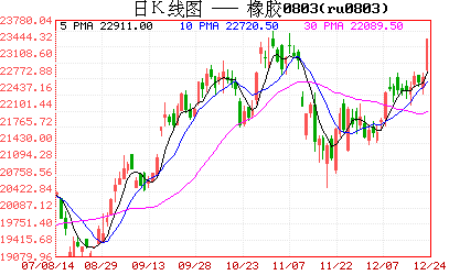 12月24日,滬膠803合約收于漲停價23600元/噸,漲905元或3.99%,因停割與上周五國際原油飆升的鼓勵,滬膠在東京膠休市的情況下,走出獨立的井噴行情。上周五,國際原油大漲逾2%, 近月2月原油合約結算價升2.25美元或2.47%,報每桶93.31美元,受汽油期貨上揚支撐,且數據顯示11月個人支出強勁,帶動美股勁揚。油價上漲再度引發化工業品價格的走強,同時,國內現貨報價持穩于21685元,也對期貨形成了強力支撐;但值得注意的是多頭并不能過于樂觀的庫存數據,上海期貨交易所上周末庫存再增1125噸至89635噸,不斷高企的庫存令滬膠能否達到25000這樣的高點存有巨大的疑問�! �