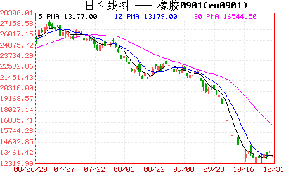 受全球金融動蕩、經濟衰退影響,6月底至今,東京膠和滬膠雙雙持續單邊深幅重挫,其中東京膠連續指數由6月27日高點354日元/千克下跌至10月28日低點155日元/千克,跌幅為199日元/千克,相對跌幅為56.2%,而滬膠連續指數則自6月27日高點28490元下跌至10月28日低點12388元,跌幅為16102元,相對跌幅達到56.5%。周四受國內央行和美聯儲雙雙降息影響,國際國內商品市場全面反彈走強,東京膠強勁反彈,滬膠聯動走強,并全線封于漲停,成交量縮減至17.6萬余手,持倉量凈減1686手至93632手,其中主力合約RU901收漲455元至13700元,膠市正脫離低位盤整,展開強勁反彈走勢。