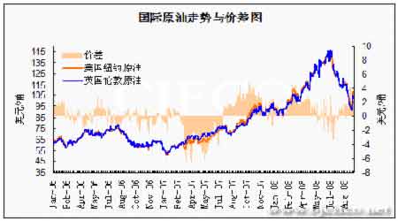 9月份,紐約商品交易所(NYMEX)原油期貨價格繼續振蕩走低,價格落入90-110美元區間。前半月,期價以回落為主,期價自月初的115美元附近回落至9月16日的月內低點低點90.42美元之后止跌反彈,但升至110美元一線后再次遇阻回落。月內整體以寬幅振蕩為主。截至9月29日,NYMEX11月原油期貨結算價大跌10.52美元,或9.84%,至每桶96.37美元,交易區間介于95.04-106.91美元。倫敦布蘭特11月原油期貨收跌9.56美元或9.23%,結算價報93.98美元,交投區間在92.64-103.29美元。
