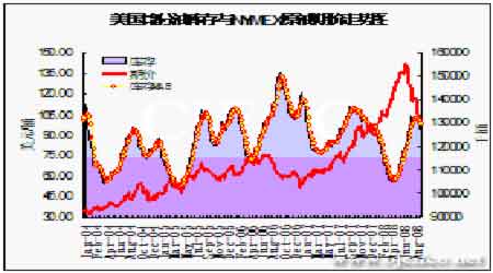 美國餾分油庫存與NYMEX與原油期價走勢圖。(資料來源:EIA 北京中期)