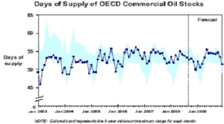 OECD國家商業原油可供供應天數及預期走勢圖。(資料來源:EIA 單位:天)