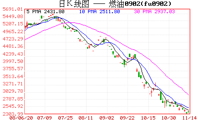 但隨著國際原油價格觸及歐佩克底線后近期出現止跌的跡象來看,后期跌幅縮減逐漸企穩的可能性較大。而滬燃油期價在10月份又跌去三分之一,跌幅巨大,且對當前利空消息吸收的較為充分,不排除已出現超跌成分。雖然后市還未有令市場轉強的因素出現,但預計價格跌速料將放緩,并會尋機企穩。目前滬燃油主力價格已經接近2007年初2500元/噸的水平,所以預計該價位會對目前的期價形成較強支撐。當然,一旦全球市場有新的利空消息出現,不排除期價會繼續跌向2000元的可能。因為當前由于金融危機所造成的市場心態不穩會加劇市場短期波動幅度。圖形上看,目前滬燃油期價下方支撐在2500元和2000元附近;上方阻力則位于3000元和3300元一線。