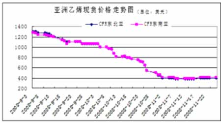 亞洲乙烯單體自9月份1360美元高位快速下跌以后在400美元關(guān)口有企穩(wěn)跡象,整個(gè)11月份都圍繞400美元一線上下波動,即使國際原油不斷下滑,東北亞、東南亞乙烯市場價(jià)格表現(xiàn)出較強(qiáng)抗跌性,乙烯價(jià)格已經(jīng)接近成本區(qū)間,由于需求疲軟,庫存仍處于高位水平,市場成交清淡,價(jià)格短期內(nèi)仍難以真正轉(zhuǎn)牛。亞洲乙烯進(jìn)口價(jià)格折算成塑料成本大約6000元左右,較國內(nèi)現(xiàn)貨成本低,因此這也制約了LLDPE期價(jià)大幅反彈動能。