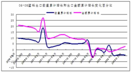 中國在06、07年分別將塑料制品出口退稅由13%下調(diào)至11%以及由11%下調(diào)到5%對塑料制品出口產(chǎn)生沉重打擊,06年到08年塑料出口數(shù)量增幅和出口金額增幅均呈現(xiàn)大幅下降,07年我國塑料制品出口額增幅僅為8.8%,與2006年的增幅18%相比出現(xiàn)明顯的下降,而08年前三季度出口額增幅幾乎為“零”。