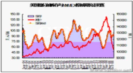 美國餾分油庫存與NYMEX原油期價走勢圖。(資料來源:EIA 北京中期)