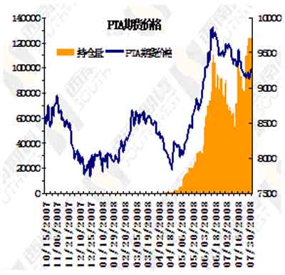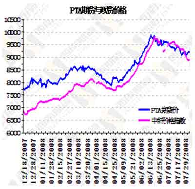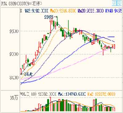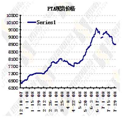 本周PTA漲跌不一,基本維持橫盤震蕩整理的格局。上周NYMEX原油期貨因美元受到優于預期的經濟數據的提振而走軟,觸及七周低點122.50美元/桶,在原油連續兩周下跌的拖累之下,周一PTA震蕩走軟,小幅下挫54元至9150元。周二受NYMEX原油期貨上漲逾1美元的提振,PTA也小幅上揚84元至9212元。周三受隔夜NYMEX原油期貨收低逾2美元的影響下,開盤快速下跌,隨后在買盤的推動下收回部分跌幅,展開窄幅波動,尾盤小幅收跌62元至9148元。周四PTA小幅上揚72元,原因是隔夜EIA統計顯示美國汽油庫存意外大幅減少350萬桶,比此前預估的上升35萬桶大相徑庭。周五盡管隔夜NYMEX原油期貨大跌2.69美元至124.08美元/桶,PTA卻低開高走,震蕩上行,尾盤收漲66元至9252元。總體來講,本周在上周大幅下跌之后收回部分漲幅,漲幅為48元。
