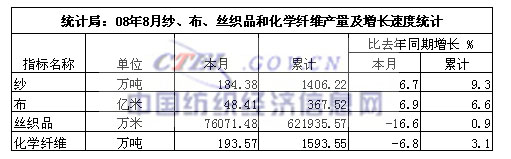 統計局:8月紗、布、絲織品和化學纖維產量及增長速度