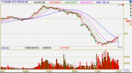 如圖所示,PTA商品期貨在2008年以半年線為分界線演繹了冰火兩重天的極端行情。上半年在美元持續(xù)貶值、原油價(jià)格飆升等利多因素影響下啟動(dòng)了一波商品市場(chǎng)的牛市行情:上半年,PTA現(xiàn)貨價(jià)格最高于6月17日漲至9800元/噸左右,而期價(jià)主力合約結(jié)算價(jià)于6月16日漲至9860元/噸左右,較年初漲幅分別為41.01%和34.74%。在此次價(jià)格上漲行情中,由于成本上漲幅度較大,利潤(rùn)空間被大大擠壓,因此PTA生產(chǎn)廠商一直面臨的嚴(yán)重虧損的境遇,且隨著價(jià)格的攀高,虧損面卻在不斷的增大。至7月份以后,百年不遇的全球金融海嘯致使全球經(jīng)濟(jì)形勢(shì)發(fā)生極大的轉(zhuǎn)變,次貸危機(jī)的再度興起并愈演愈烈,使得全球大宗商品價(jià)格走勢(shì)發(fā)生極大的逆轉(zhuǎn),在原油價(jià)格飛速下跌的帶動(dòng)下,上半年的牛市行情就此終結(jié),而后迎來(lái)了迅猛的單邊下跌行情,并連創(chuàng)近年來(lái)價(jià)格新低,直到現(xiàn)貨價(jià)格于11月14日至低點(diǎn)4280元/噸,年末各國(guó)政府積極救市,價(jià)格終于在12月份止跌企穩(wěn),振蕩上行才開始呈現(xiàn)見底反彈走勢(shì)。