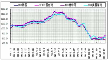 2008年聚酯新增產能約200萬噸,產能增幅8.58%,總產能約合2530萬噸,而2008年,面對行情的低迷即需求的疲弱,開工率有較大幅度降低,按照消耗系數0.865和開工率70.0%計算,可消耗PTA1531萬噸/年,除去560萬噸的進口量,將消耗國內PTA產量971萬噸,而國產PTA在2008年的產量基本上為980萬噸,這在一個側面反應出,前期的PTA供應一直存在相應有些過剩的局面,致使在前期PTA價格在成本增長不斷推漲價格的局勢下,PTA廠商仍面臨虧損的局面。從全年的行情來看,聚酯行業同樣受產能的加速擴張而下游市場疲弱的拖累而面臨兩難困境,從而使得聚酯廠商一直處于微利或虧損狀態,這從2008年下半年以后眾多的聚酯化纖廠商的破產倒閉或重組的事件中可見其形勢的嚴峻,聚酯企業的開工率較去年大幅下滑,保守估計在70%左右的水平,整個聚酯行業也面臨著重新洗牌或產業重組的格局。從PTA需求量以及聚酯的當前產量等幾項數據來對比,2008年可以基本判斷聚酯增長已經較2007年停滯甚至倒退。2008年上半年隨著國際油價節節攀升的帶動之下,石腦油、MX等石化芳烴產品漲勢驚人,FOB韓國PX價格最高于6月13日達到1685美元/噸,較年初時增長573.75美元/噸,增長幅度達51.6%。隨后就是一路直下,于11月5日至最低點552.5美元/噸,下跌1132.5美元/噸之巨,跌幅為67.21%。MEG產能的快速擴張,致使從年初以來,價格持續下跌,至年末隨著前期產量的調整加之PTA回穩小幅走高而相應有所回漲。