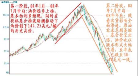 始于07年下半年的美國次貸危機終于在08年全面爆發并延伸到實體經濟,在拖累經濟的同時也大大地削減了人們對商品的需求,投機資金更是瘋狂出逃,促使商品期貨價格以跳水形式大幅下滑。國際原油價格從147美元的高位一度下跌近80%至32美元附近,幅度之深令人詫舌。而在辭舊迎新之際,油價仍沒有擺托頹廢下行之勢,價格波動在30—40美元區間。