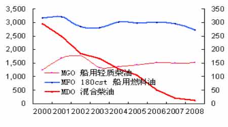 新加坡市場在這波金融風暴過后,市場整體銷售量較往年明顯下滑。除MGO船 用輕質柴油市場份額有所增強。MFO180船用燃料油銷量自2008年初起就開始呈現下降趨勢,表明海上運輸業的不景氣。從市場氛圍來看,新加坡買賣成交不興,但從我們拿到的銷售數據來看,目前僅有近期新加坡的船用輕質柴油銷量因價格走低,銷量稍有抬頭。