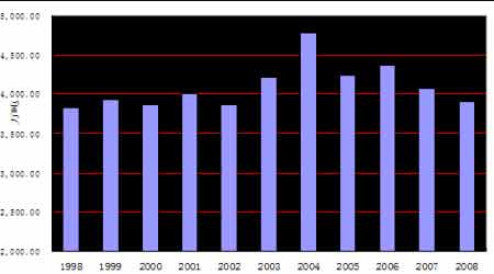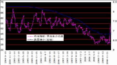 08年年初燃油指數從4020元上漲至7月中旬的最高點5596元轉而下跌,12月初見最低2121元,同期原油指數從年初最低85美元上漲至7月中旬高點147.94美元,12月最低點報40.67美元,基本保持了較高的相關性。從燃料油04年10月上市以來與原油的比價來看,08年總體呈現下降趨勢。在08年前的三年中,比價均值位于55倍左右,08年6月最低下降至37倍。