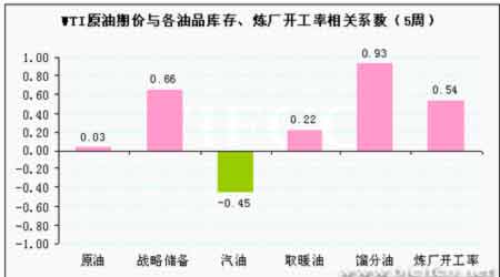 WTI原油期價與各油品庫存、煉廠開工率相關系數走勢圖。(來源:北京中期)