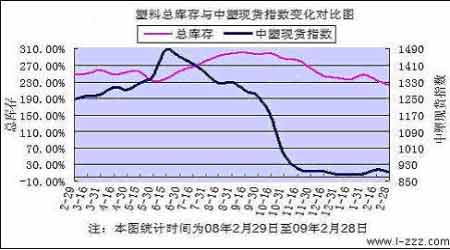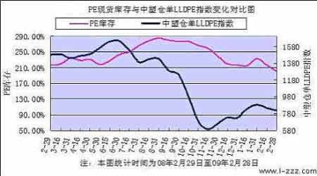 根據(jù)浙江塑料城的倉(cāng)單來(lái)看庫(kù)存狀況,塑料總庫(kù)存從去年11月份開始逐漸下滑。國(guó)際金融危機(jī)對(duì)塑料價(jià)格影響極大。早在去年6月開始,中國(guó)出口就開始受到嚴(yán)重抑制,玩具及包裝制品等低附加值商品出口量銳減。對(duì)塑料的需求同時(shí)大幅降低。生產(chǎn)企業(yè)為了應(yīng)對(duì)大量積壓產(chǎn)品,不等不減少生產(chǎn),同時(shí)減少原料采購(gòu)。因此出口量1月份下旬倉(cāng)單持續(xù)減少,但至2月上旬庫(kù)存量稍有增加,這是由于春節(jié)下游企業(yè)備貨后基本停工休息。至2月下旬下游企業(yè)逐漸開工,倉(cāng)單數(shù)又開始繼續(xù)下行。