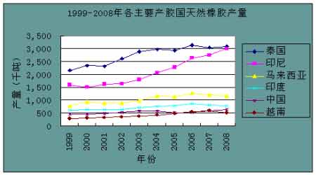圖為1999-2008年各主要產膠國天然橡膠產量走勢圖。(圖片來源:IRSG)