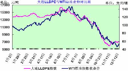 圖表4:大連LLDPE 期貨指數與WTI 原油走勢對比圖(2008 年)