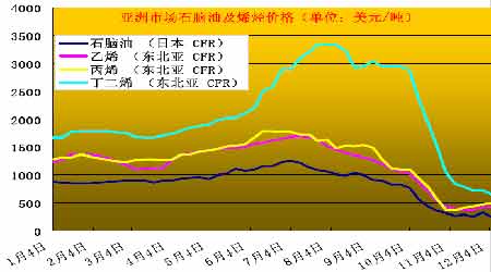 石腦油價格同樣隨著原油走低而下挫。以日本石腦油價格為例,7 月份最高價格到過1200 多美元/噸,而如今1 月下半月日本公開規格石腦油價格下跌15.00 美元至每噸252.50 美元,4 個多月來跌幅近80%。近期裂解價差再次滑落至兩周低點,因庫存處于高位持續令市場人氣承壓,較ICE布蘭特原油裂解價差小幅擴大73 美分至每噸貼水65.13 美元,處于低位震蕩走勢中。但是有消息稱韓國第二大石化廠商YNCC 將提升產量以滿足緩慢恢復的需求,市場人氣受到輕微提振. YNCC 同時是韓國最大的乙烯生產商.其將在12 月10 日重新啟動下屬三家裂解廠中最小的一家。日本公開規格09 年1 月下半月抵達的基準石腦油合約挫低6.00 美元至每噸262.00 美元,而1 月下半月與2月上半月的半月互換價差報負2.00 美元。臺灣臺塑石化公司計劃12 月中旬將其三套石腦油裂解裝置的平均開工率從50%提高至60%,預期地方消耗量將穩定。然而,貿易商依然謹慎,指出全球經濟恢復之前,石化需求不可能恢復到正常水平。臺塑石化第一套石腦油裂解裝置和第二套裝置產能分別為70 萬噸/年和103.5 萬噸/年,自10 月末以來開工率為80%-85%。臺塑石化第三套產能為120萬噸/年裂解裝置,亞洲最大裝置,自9 月3 日以來一直被關閉。原計劃在完成例行檢修后于10月末重啟,但后來因下游消費需求疲軟而推遲。目前市場基本面情況依然悲觀,消費需求低迷,剩余產能過剩。后期石腦油市場需求前景難以樂觀,將隨原油走勢面臨更多看跌因素。中石油、中石化兩大集團的石腦油價格在12 月份繼續下調。