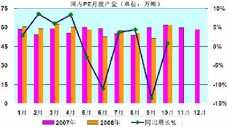 今年1-10 月國內PE 累計總產量為579.5 萬噸,較2007 年(570.9 萬噸)增加8.6 萬噸,增幅為1.5%�?傮w趨勢是,進口量呈下降趨勢,而國內產量逐漸增大;市場供給充足,下游有效需求不振。