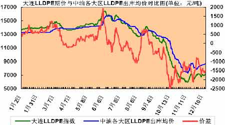 圖為大連LLDPE 期價與中油各大區LLDPE 出庫均價走勢圖。(圖片來源:卓創資訊,長城偉業期貨北京營業部)
