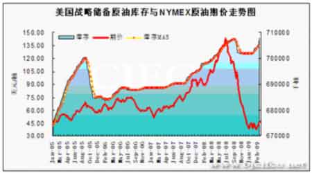 美國戰略儲備原油庫存與NYMEX原油期價走勢圖。(來源:北京中期)
