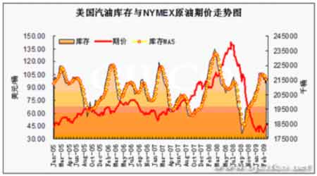 美國汽油庫存與NYMEX原油期價走勢圖。(來源:北京中期)