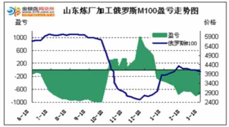 圖為山東煉廠加工俄羅斯M100盈虧走勢(shì)圖。(圖片來源:中瑞金融)