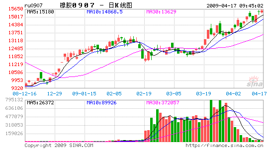 近階段,國內外膠市始終運行階段性漲勢之中。4月13日,東京膠連續指數創下去年11月12日高點179.66日元/千克以來整整4個多月新高177.87日元/千克;16日,滬膠連續指數則創下去年10月10日高點18258元以來整整5個多月以來新高15737元,主要合約盤中一度封于漲停。筆者分析認為,美汽車商獲得救援資金、全球各國普遍對汽車產業進行大規模刺激計劃,而中國汽車也受到產業振興計劃激勵而穩步增長,上游供應漸趨緊張,由此而導致天膠市場展開穩步階段性漲升行情。