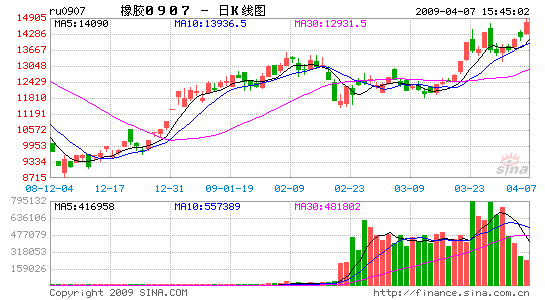 隨著全球重要經濟體刺激經濟政策的推出,國內和國外的汽車業有了回暖的跡象,一直困擾橡膠市場的需求擔憂有所緩解。國內陸續出臺提高輪胎出口退稅、汽車振興方案和國家收儲等一系列扶持措施,為滬膠探底回升提供了政策支撐。前期滬膠907合約在11500-13000點區間內運行已經3月有余,隨著整理區間的逐步收斂,近日出現了明顯的突破信號。