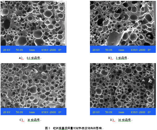 圖3(A-D)結果顯示,隨著晶須用量的增加,材料表皮的泡孔越來越小,即說明材料表皮越來越致密。