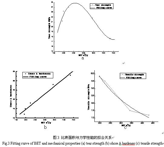納米二氧化硅粉體的剛性鏈狀結構是補強作用的基本骨架,如圖3所示,硬度隨比表面積的增大而成線性遞增,撕裂強度在250比表面積左右達到最大,拉伸強度在200比表面積左右最大。但比表面積的越大,粒徑越小,粉體表面間的結合能越大,粉體在硅橡膠中的分散越困難,因而補強作用下降。